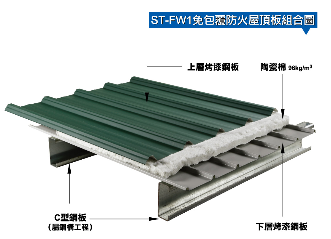 • ST-FW1免包覆防火屋頂板組合符合內政部30分鐘時效。